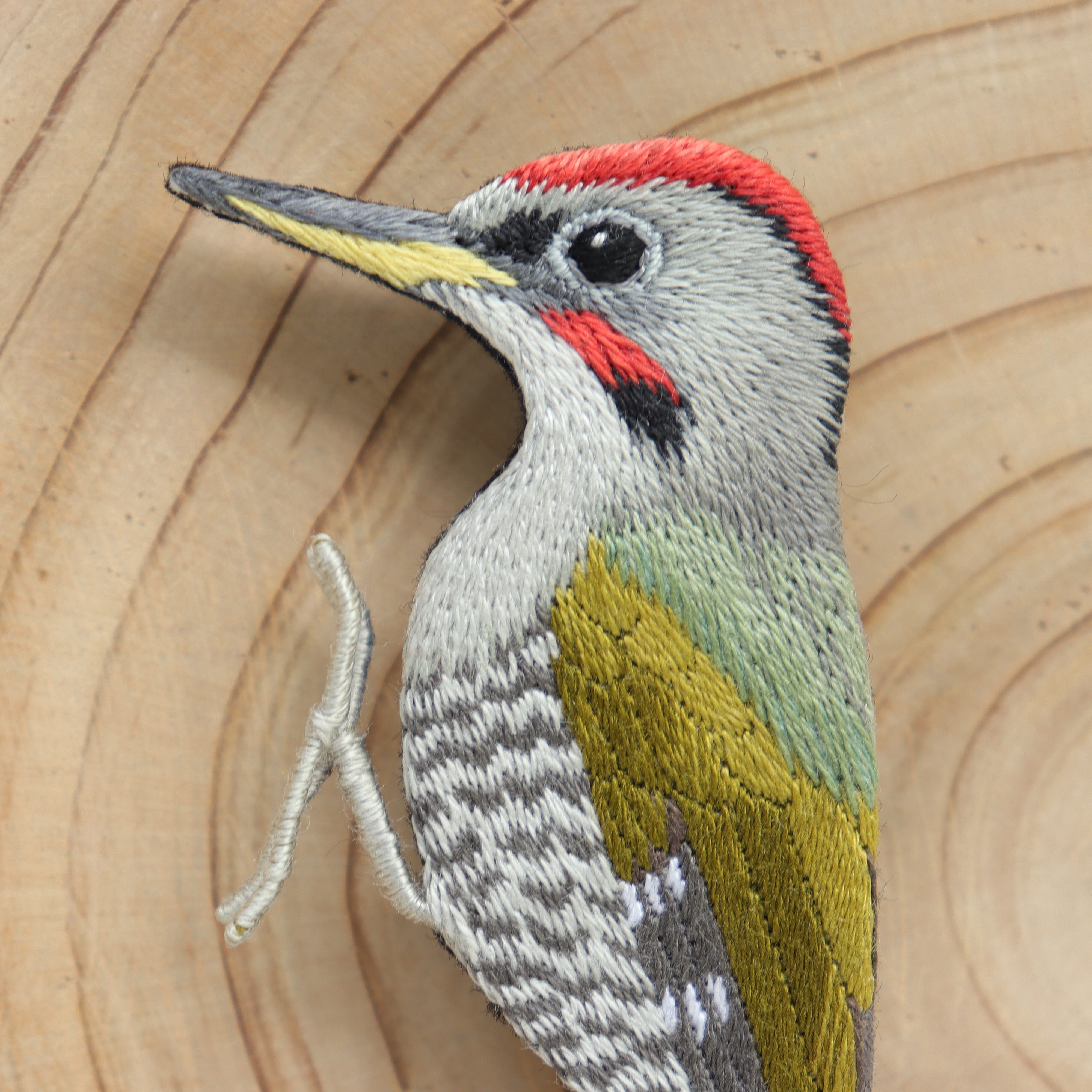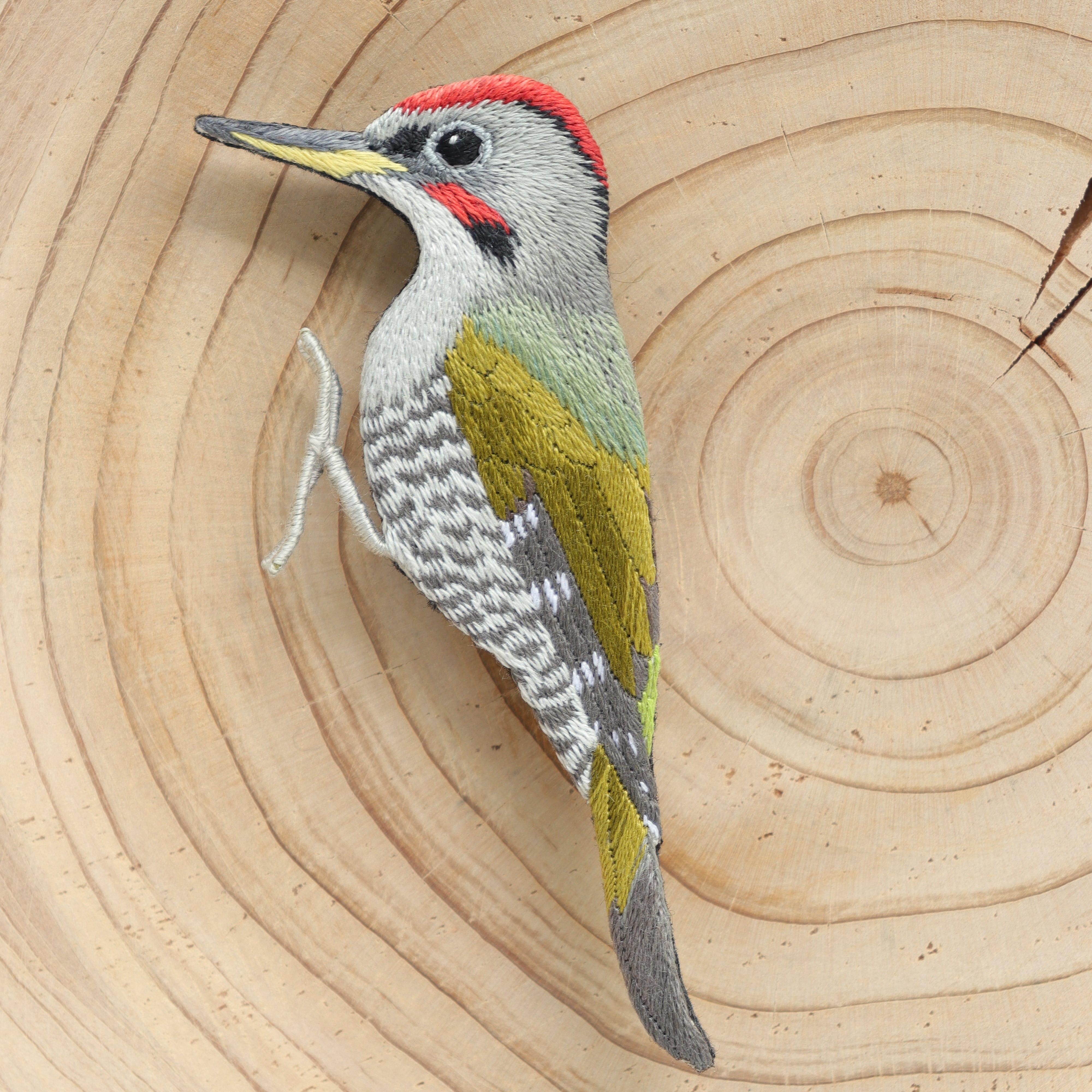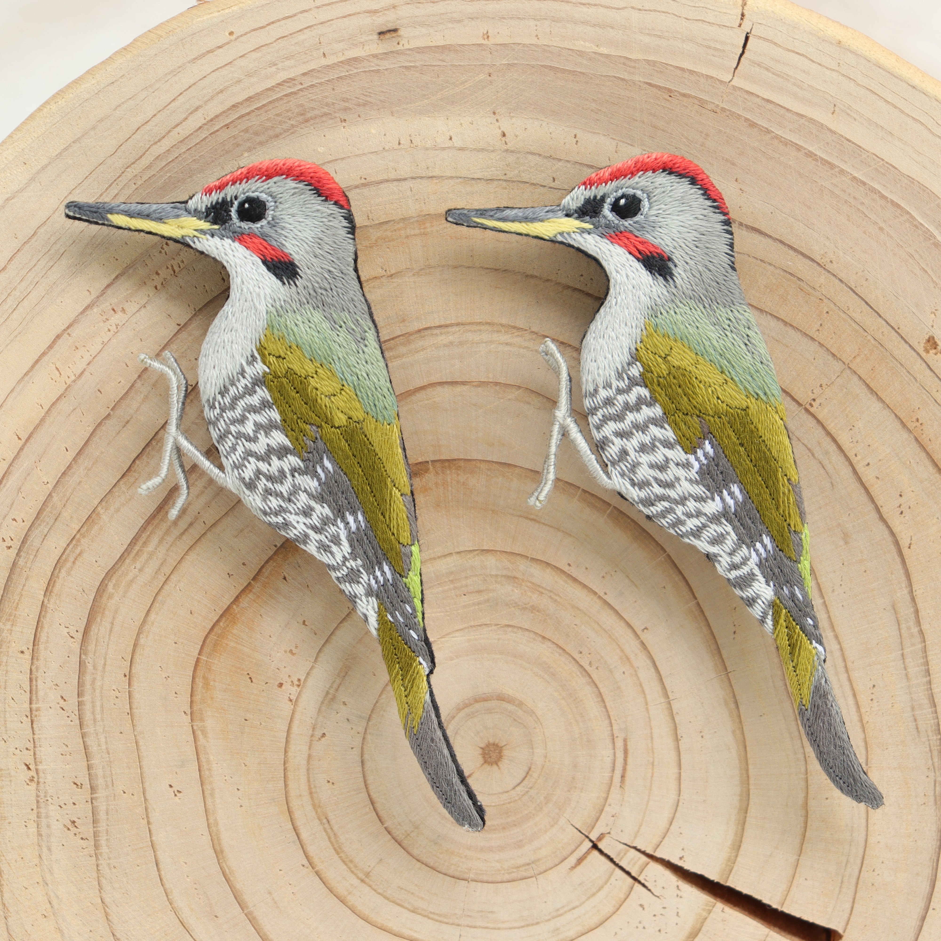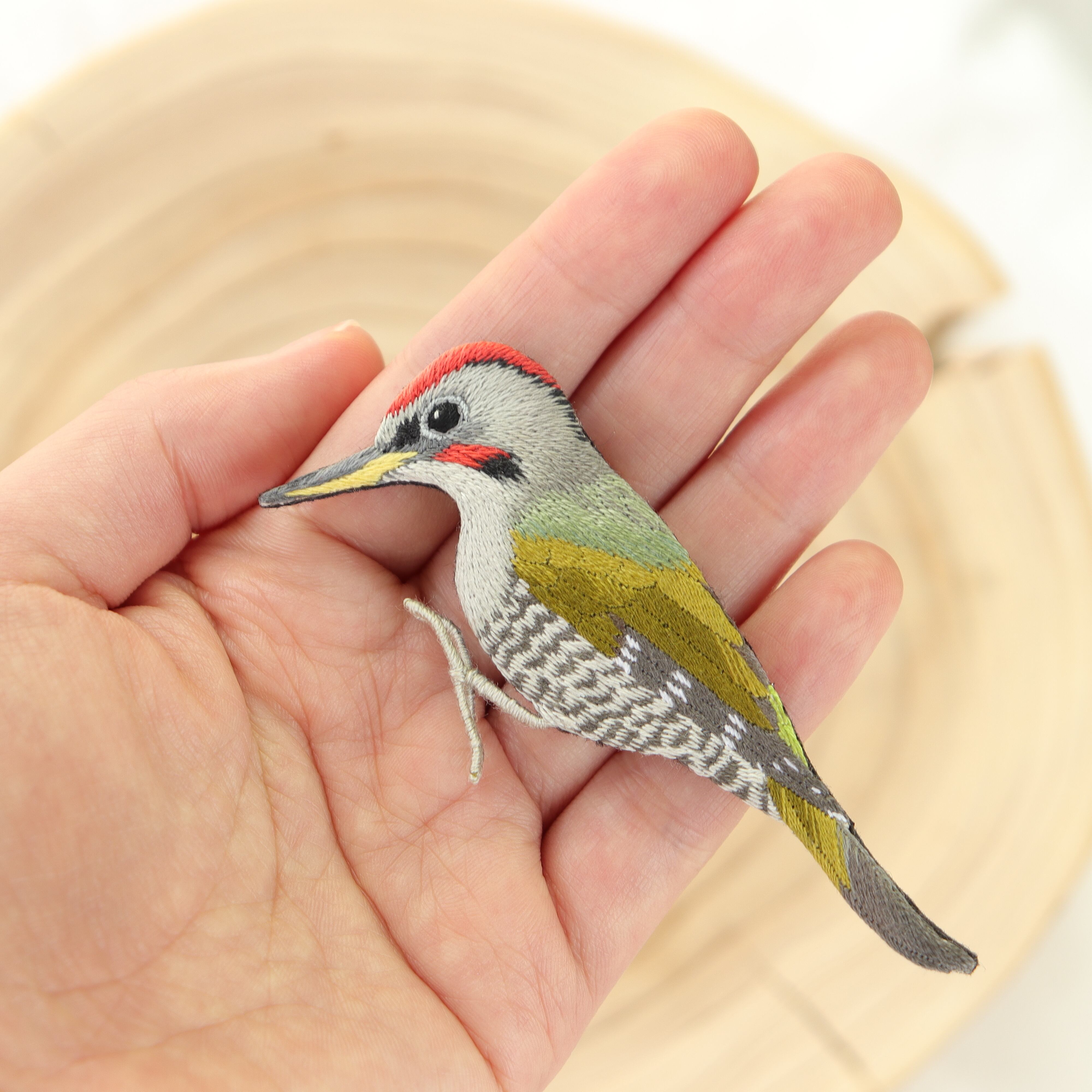 アオゲラの刺繍ブローチ