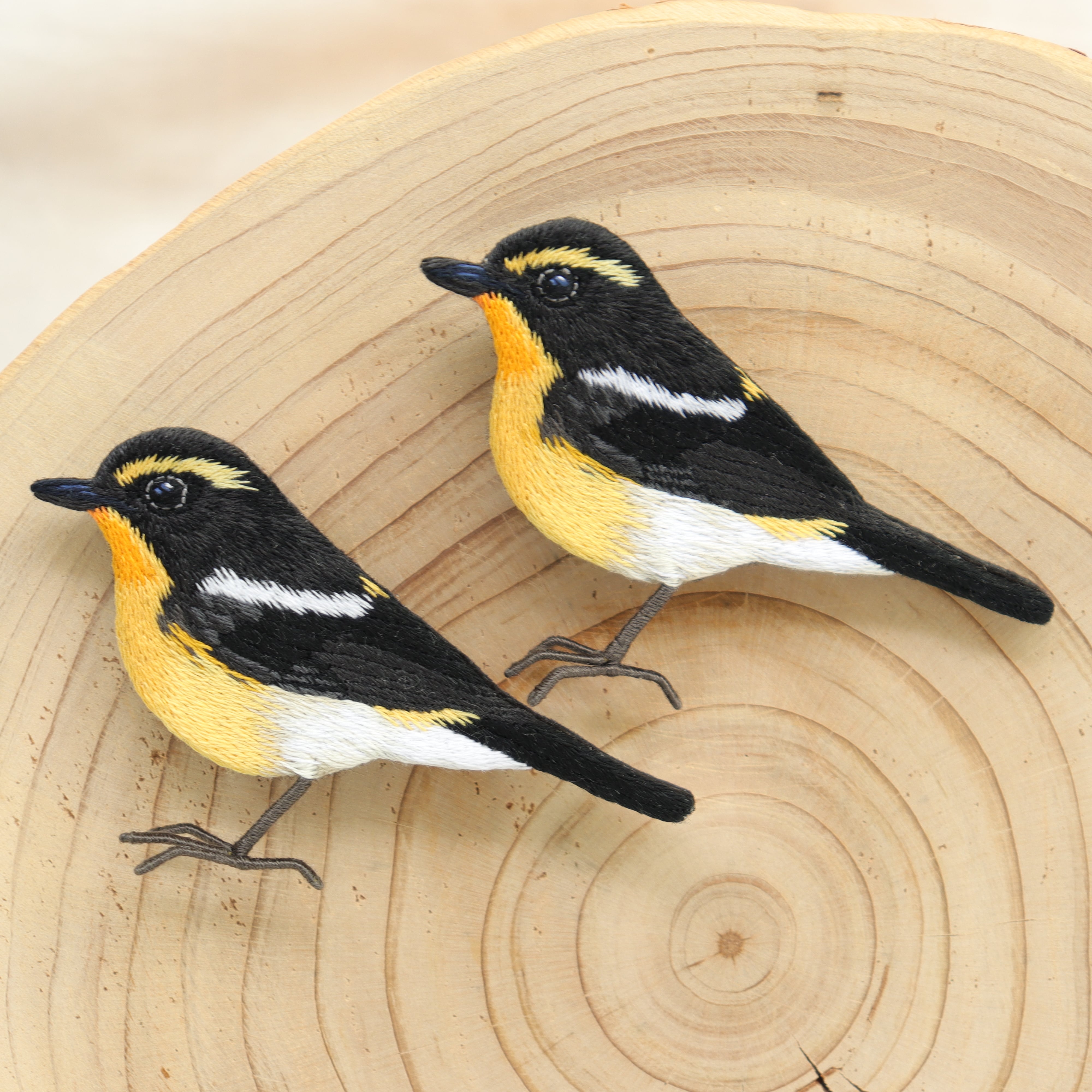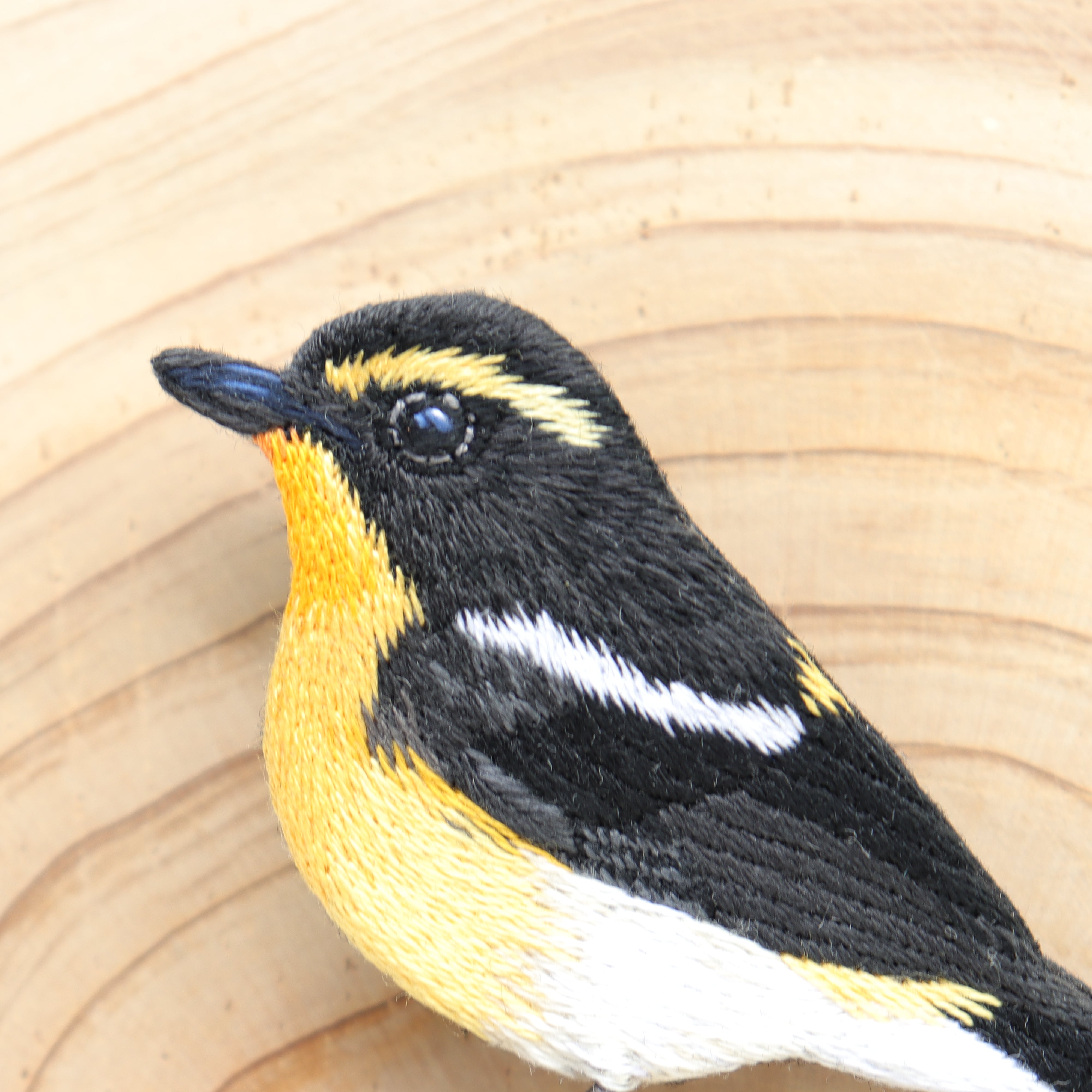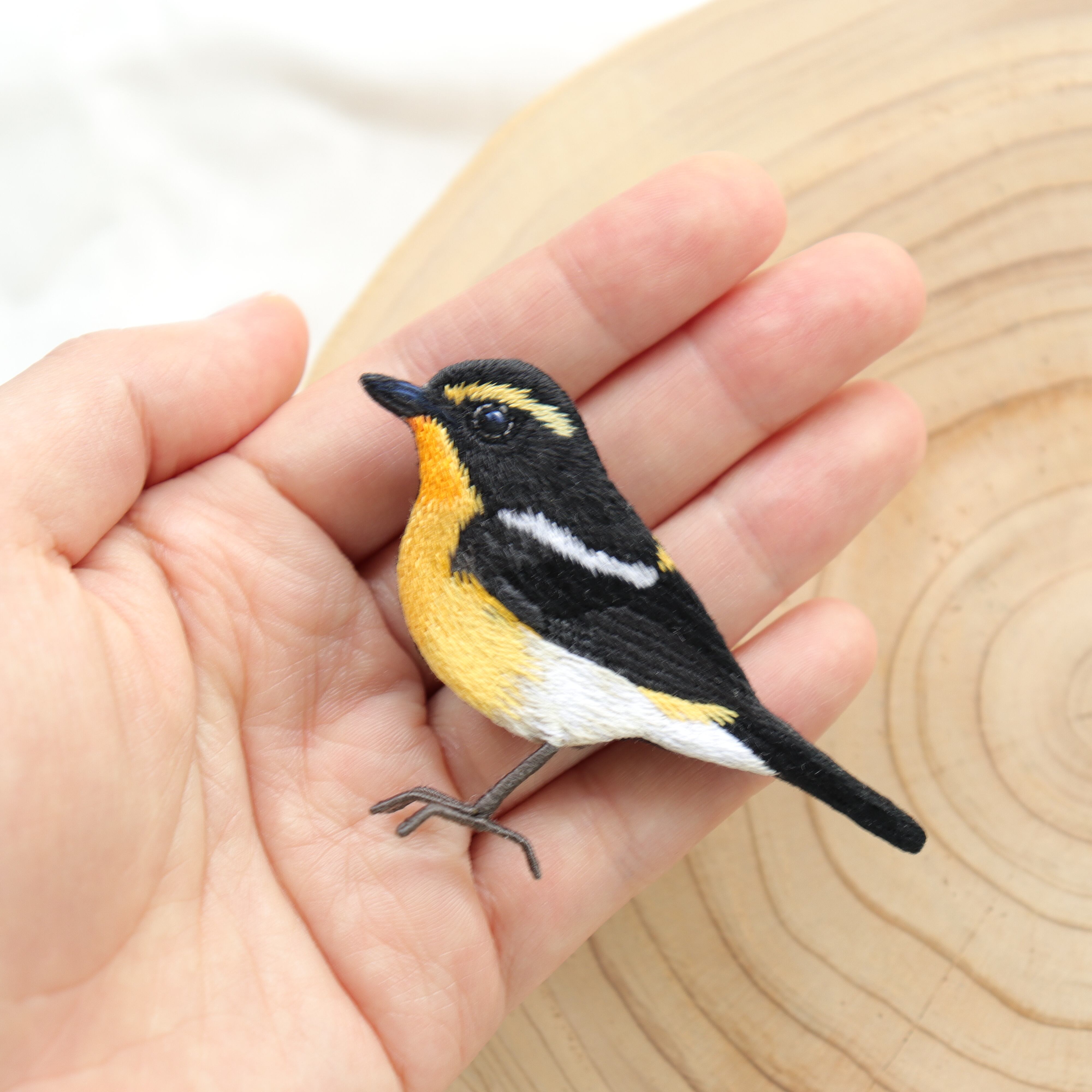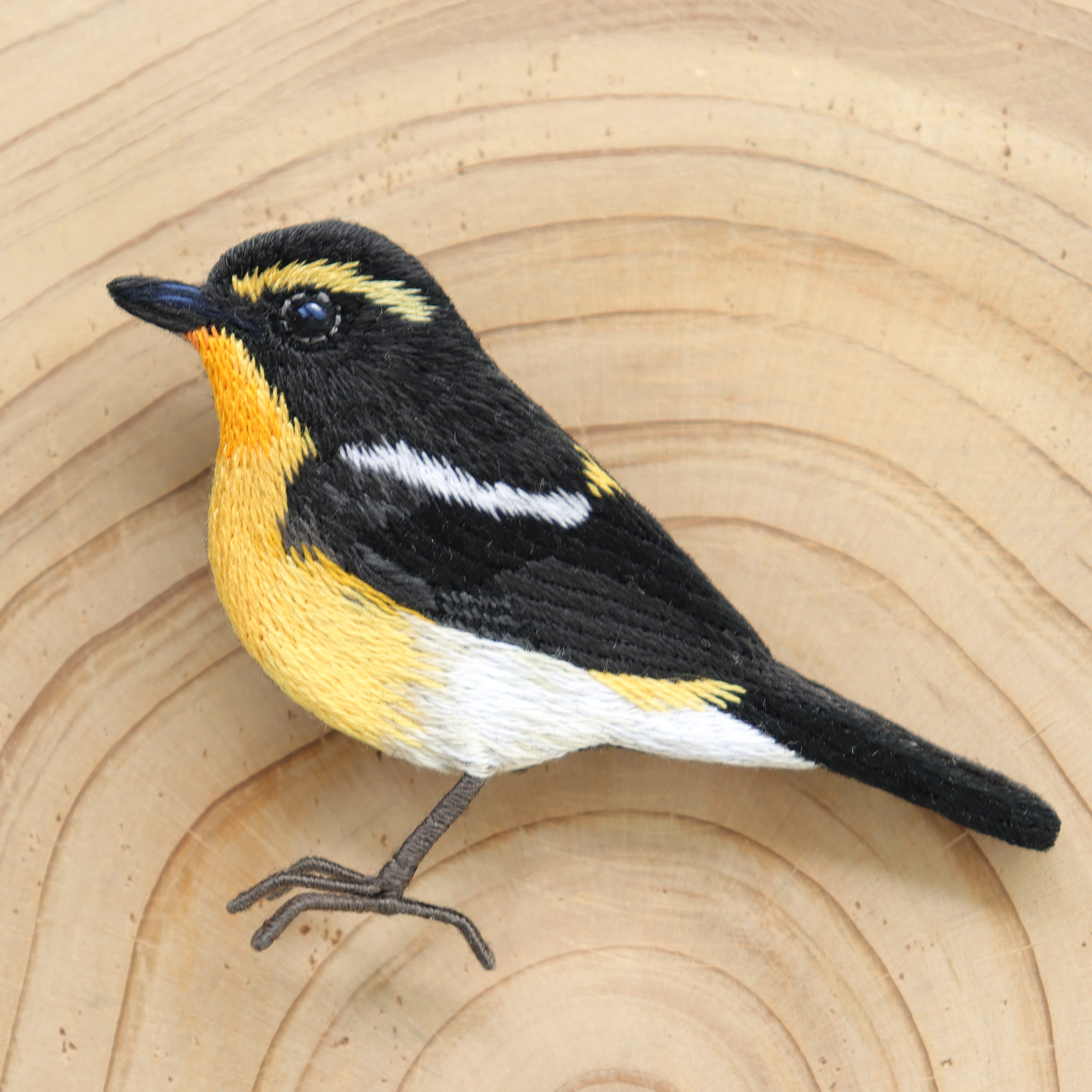 喉から腹部の目の覚めるような黄色が美しいキビタキを刺繍でブローチに仕上げました