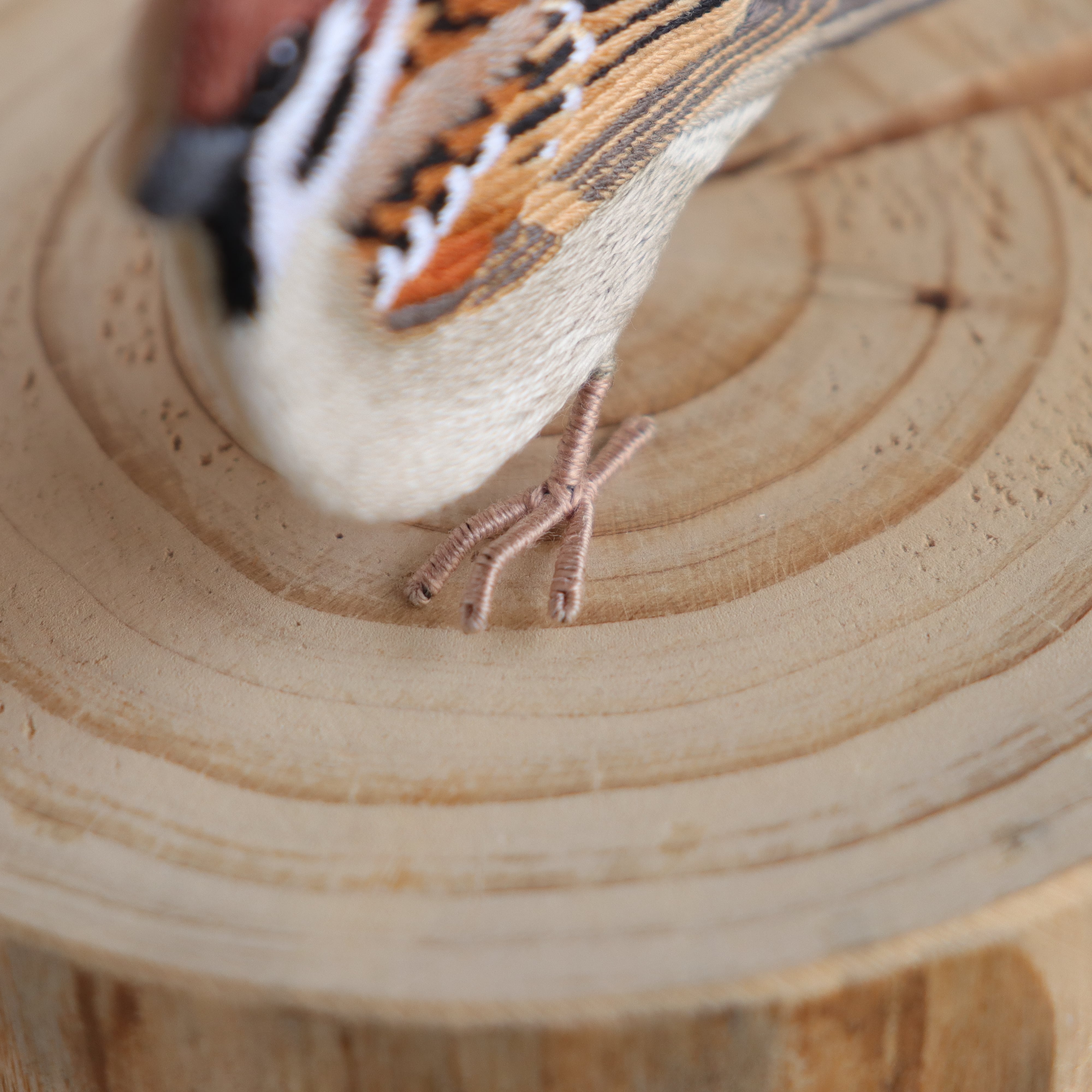 ふわっと丸い姿が愛らしいスズメたちを本物に忠実に刺繍で再現しました。