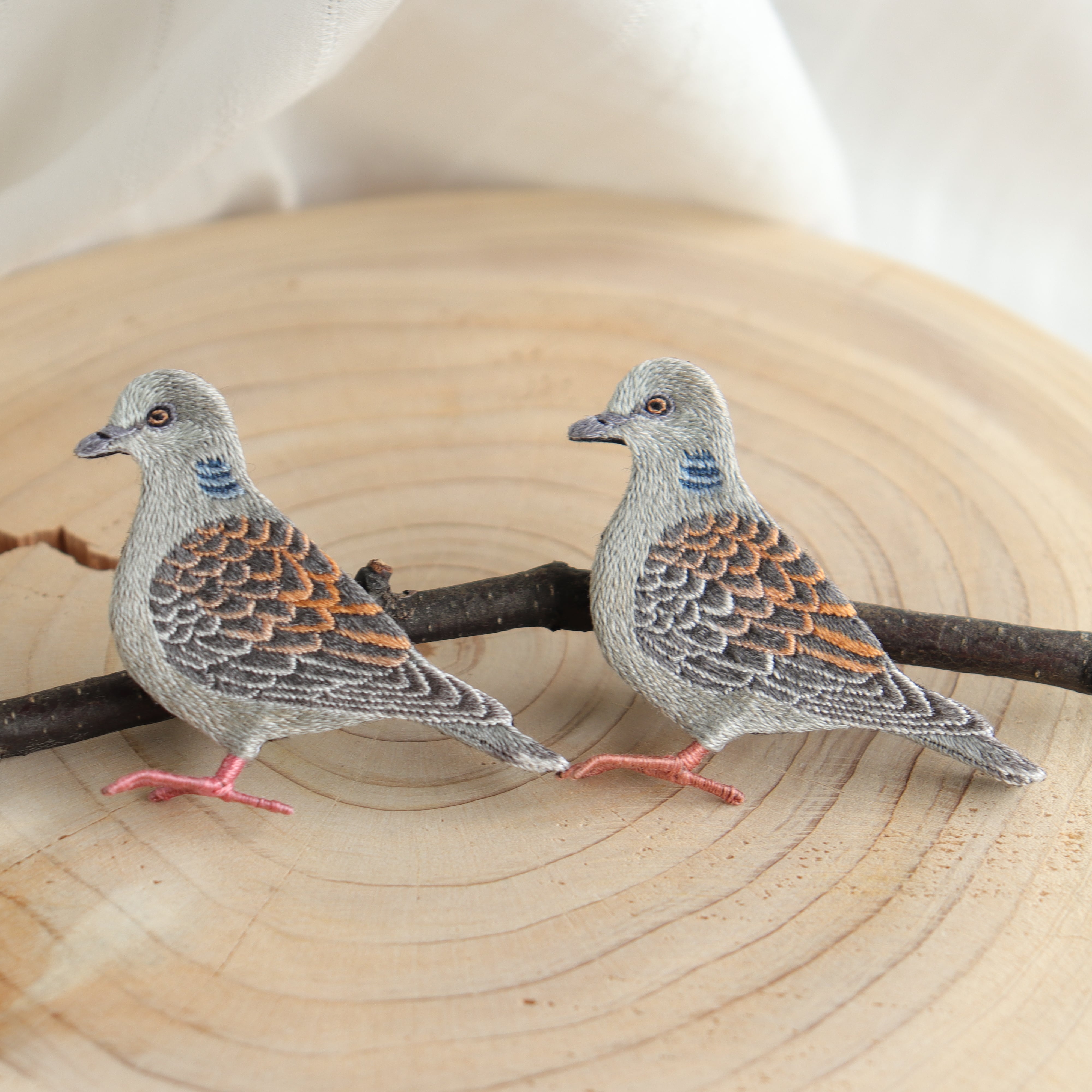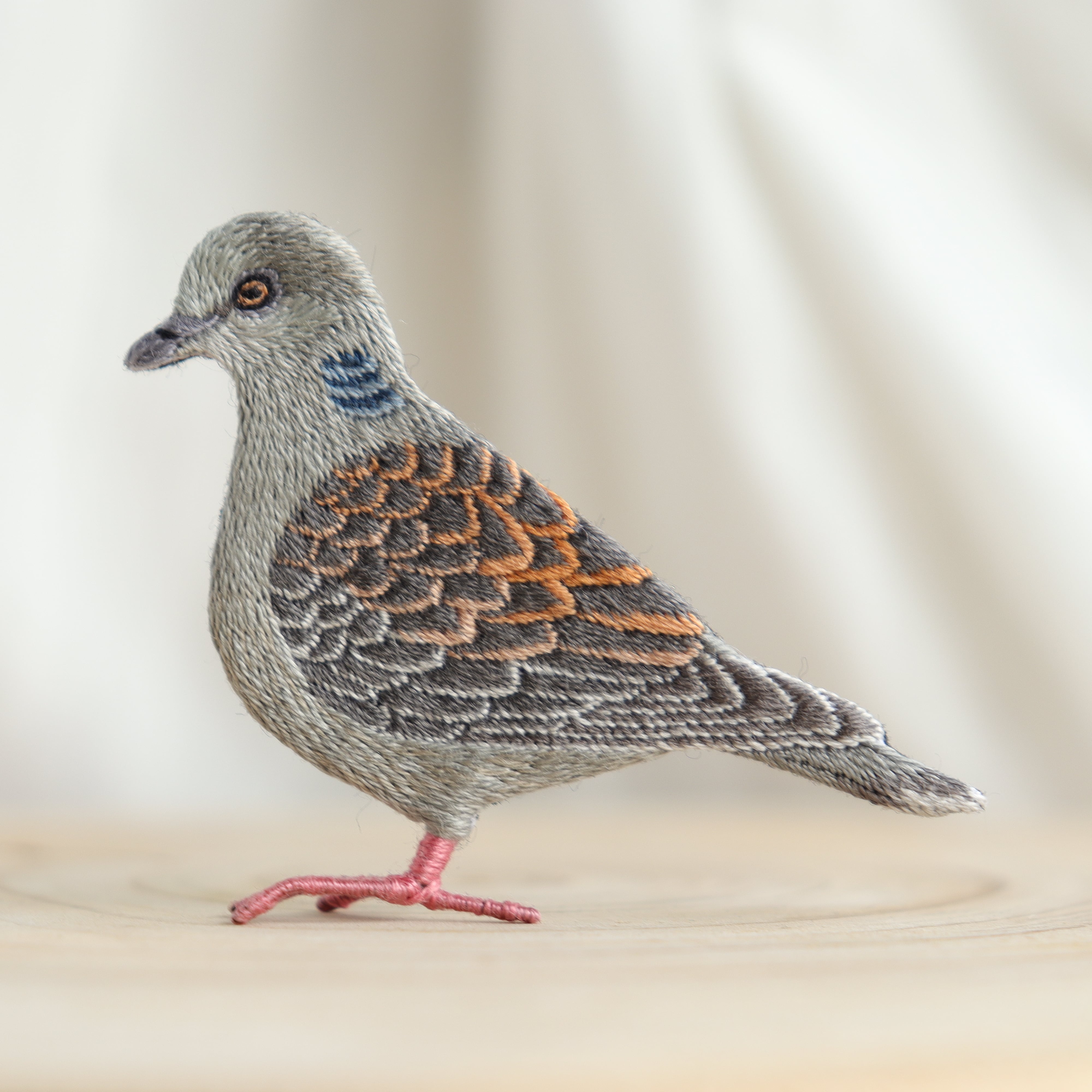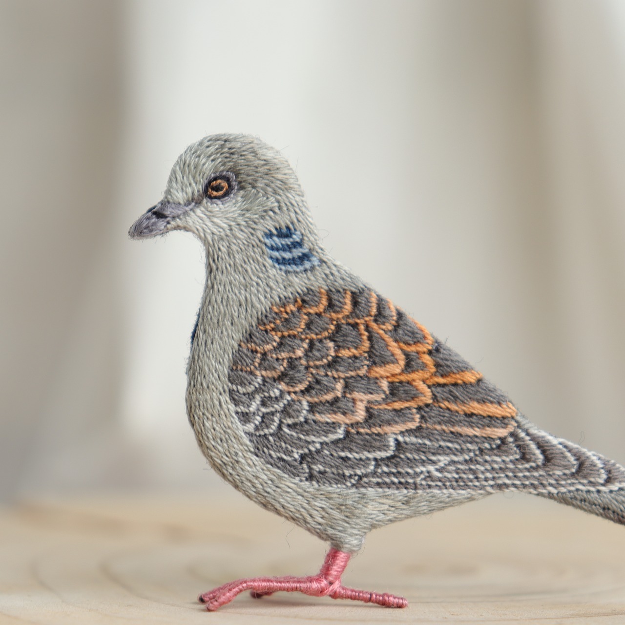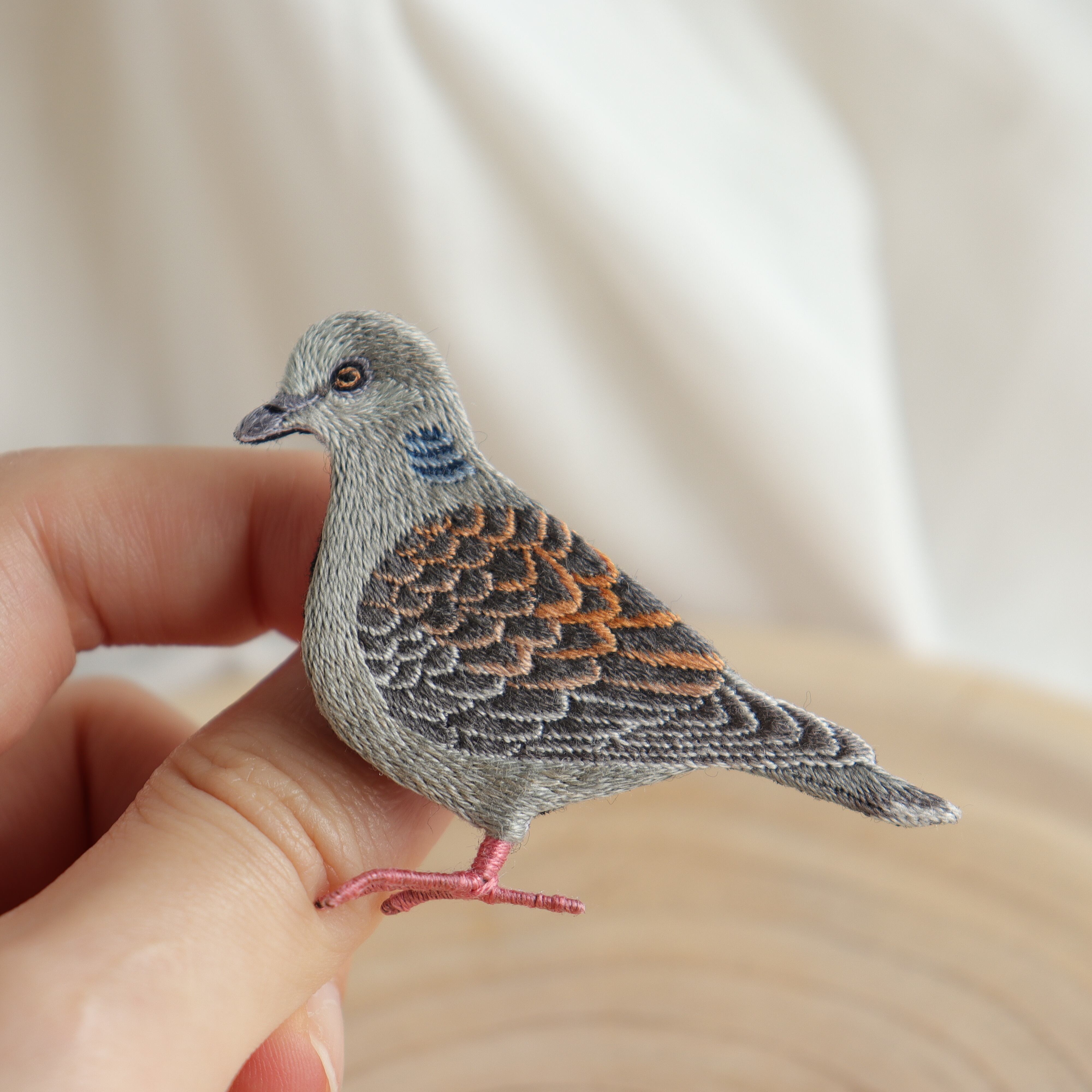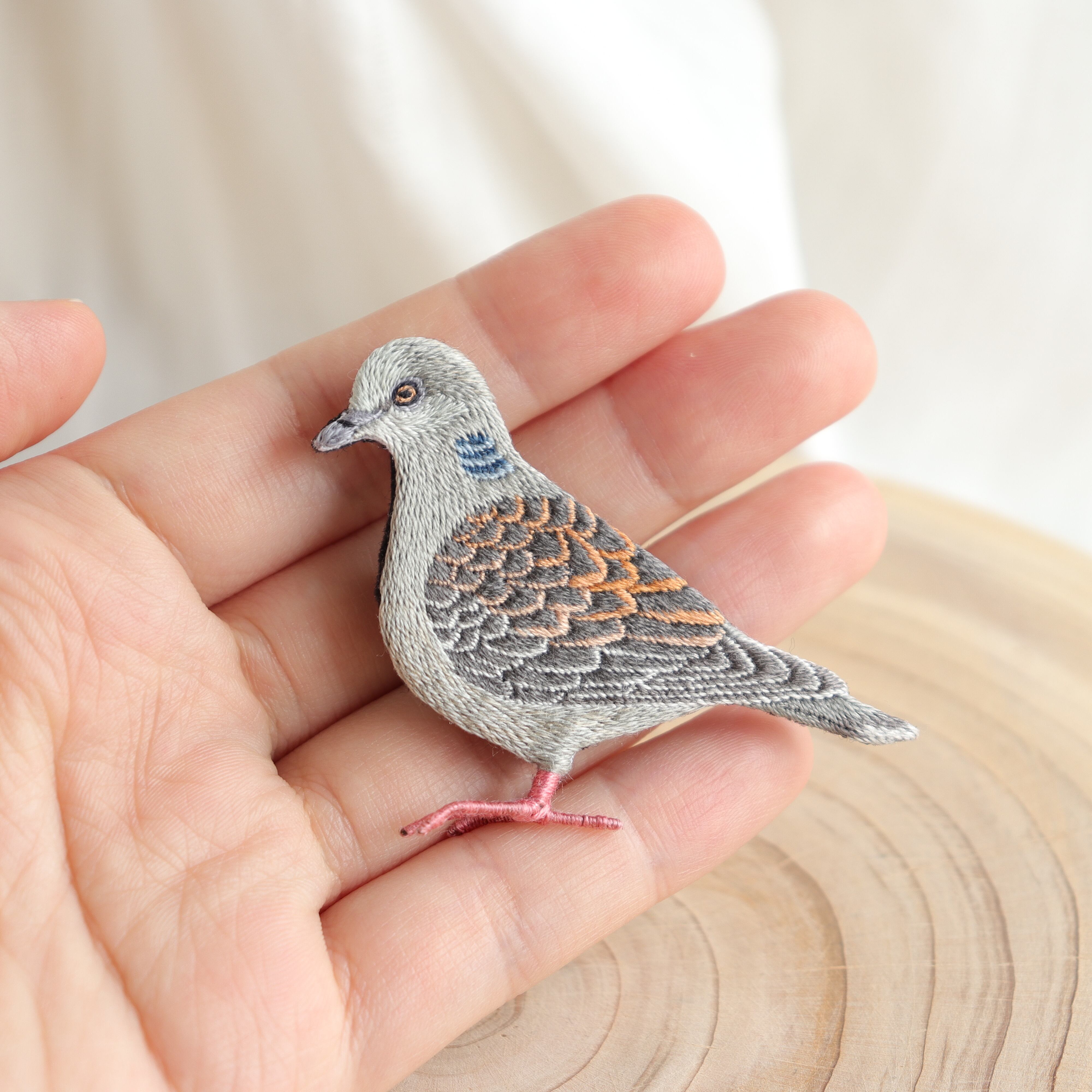 羽の模様が美しいキジバトを本物に忠実に刺繍で再現しました。