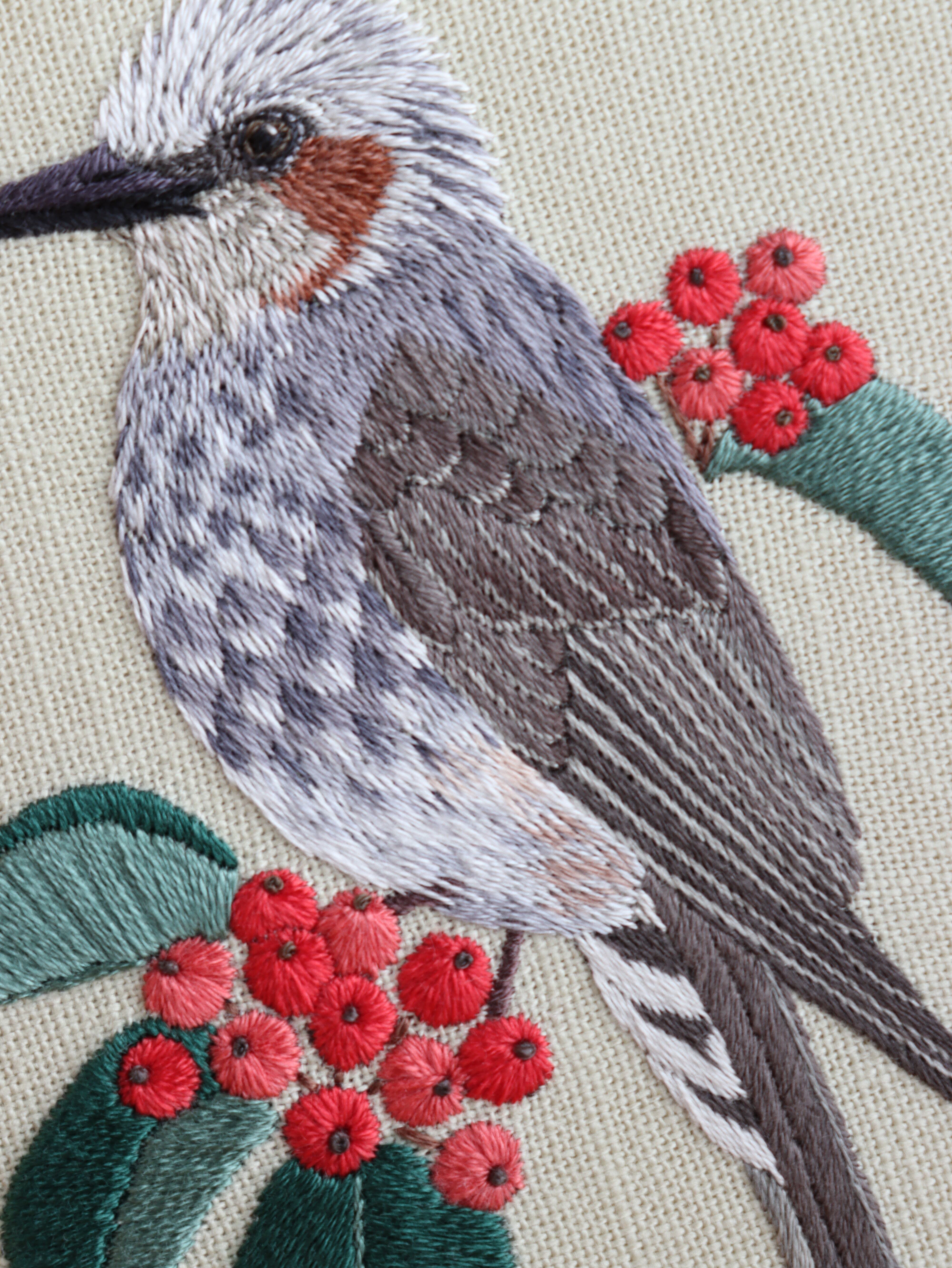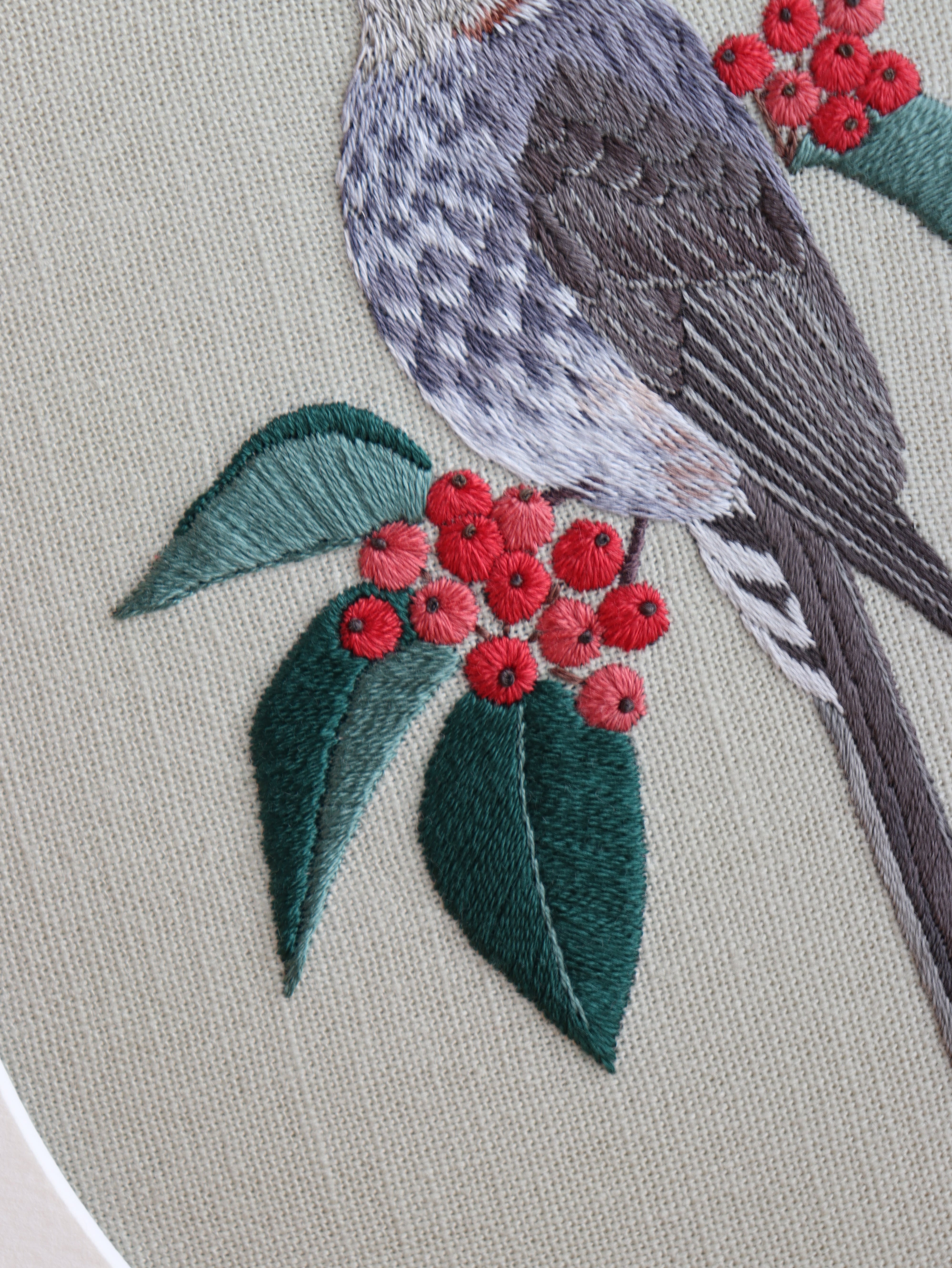 秋から冬に可愛らしい赤い実をつけるクロガネモチと一緒に刺繍しました