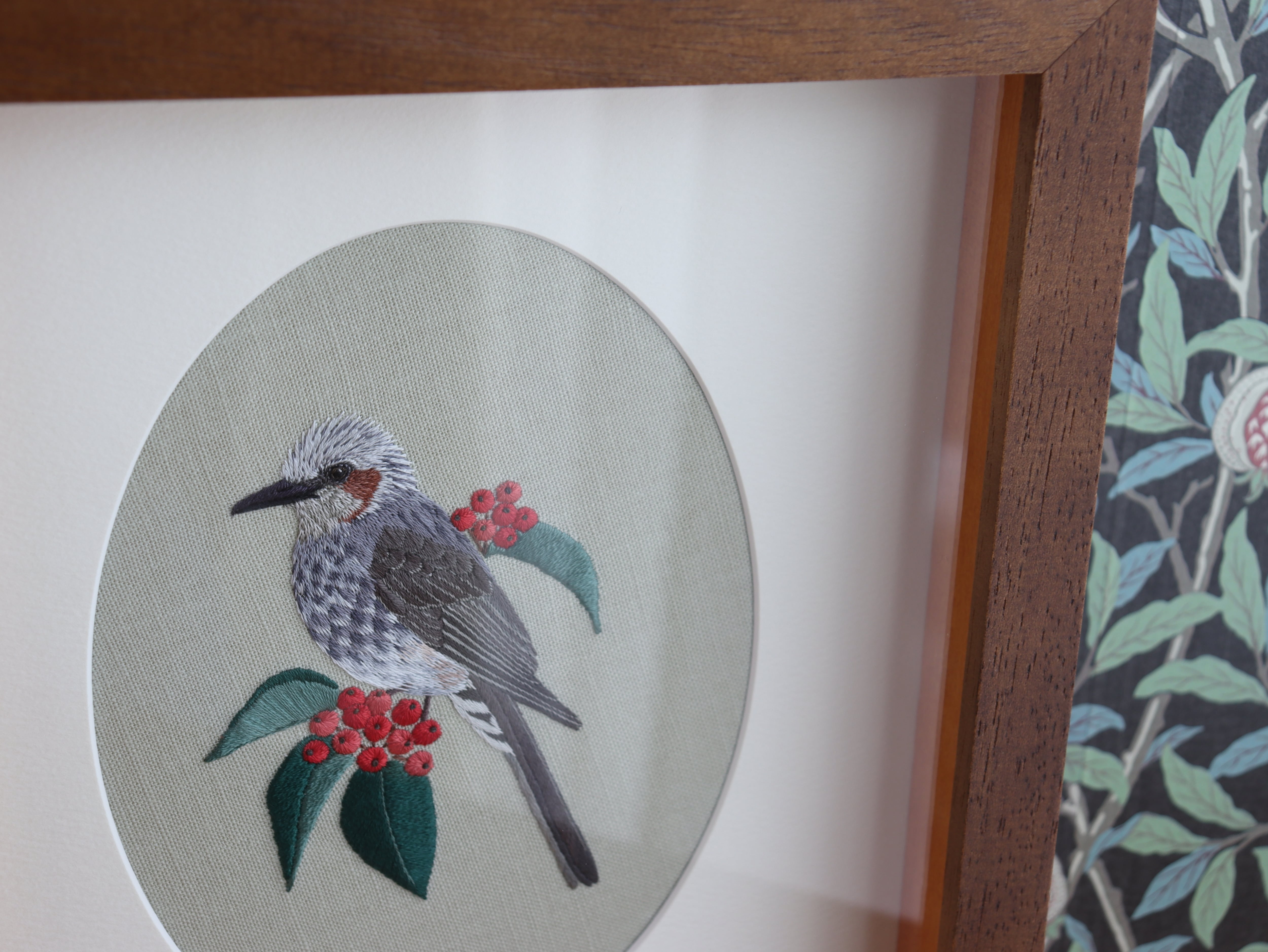 額縁は刺繍の質感を損なわないようアクリル板と作品の間にスペースのあるボックス額縁を使用しています