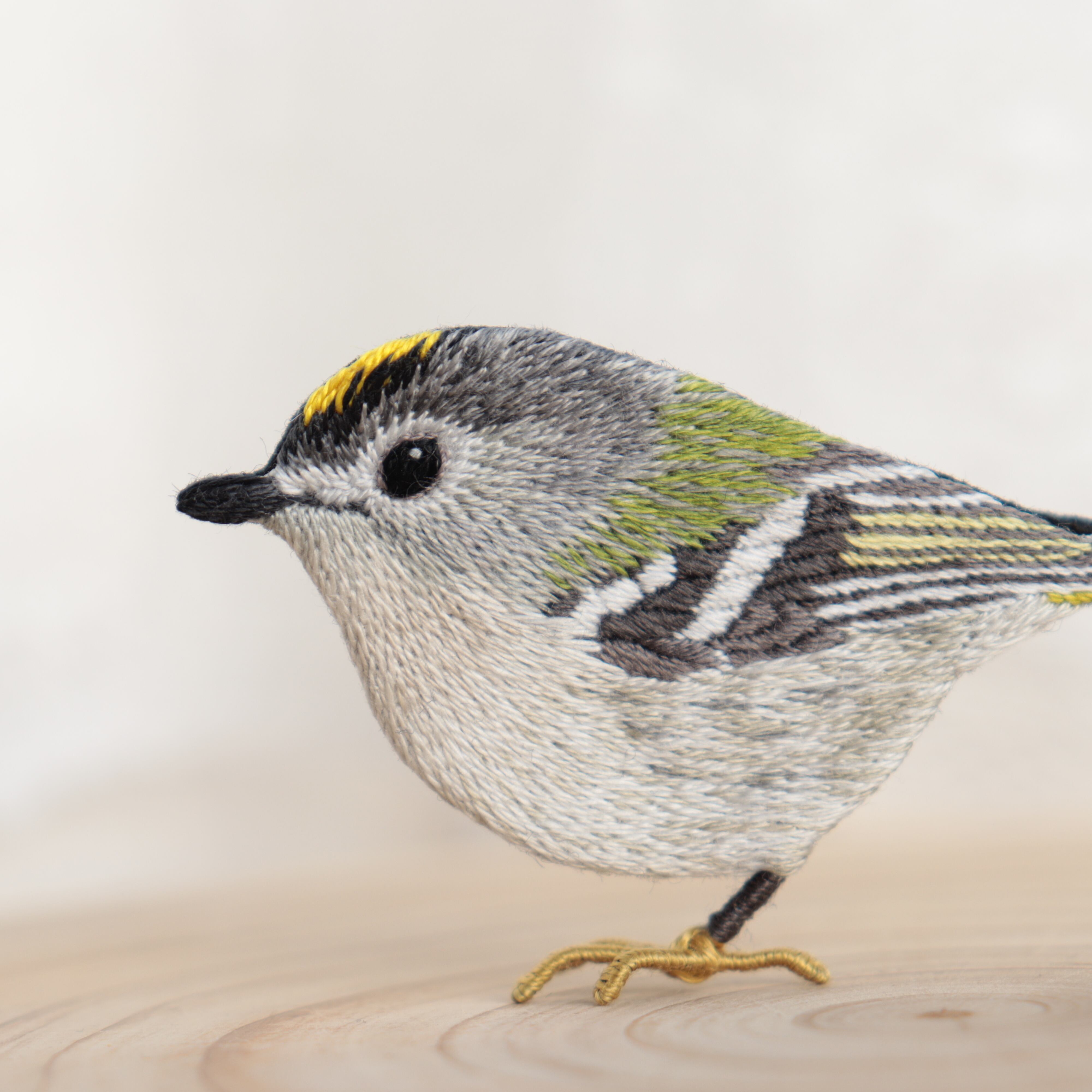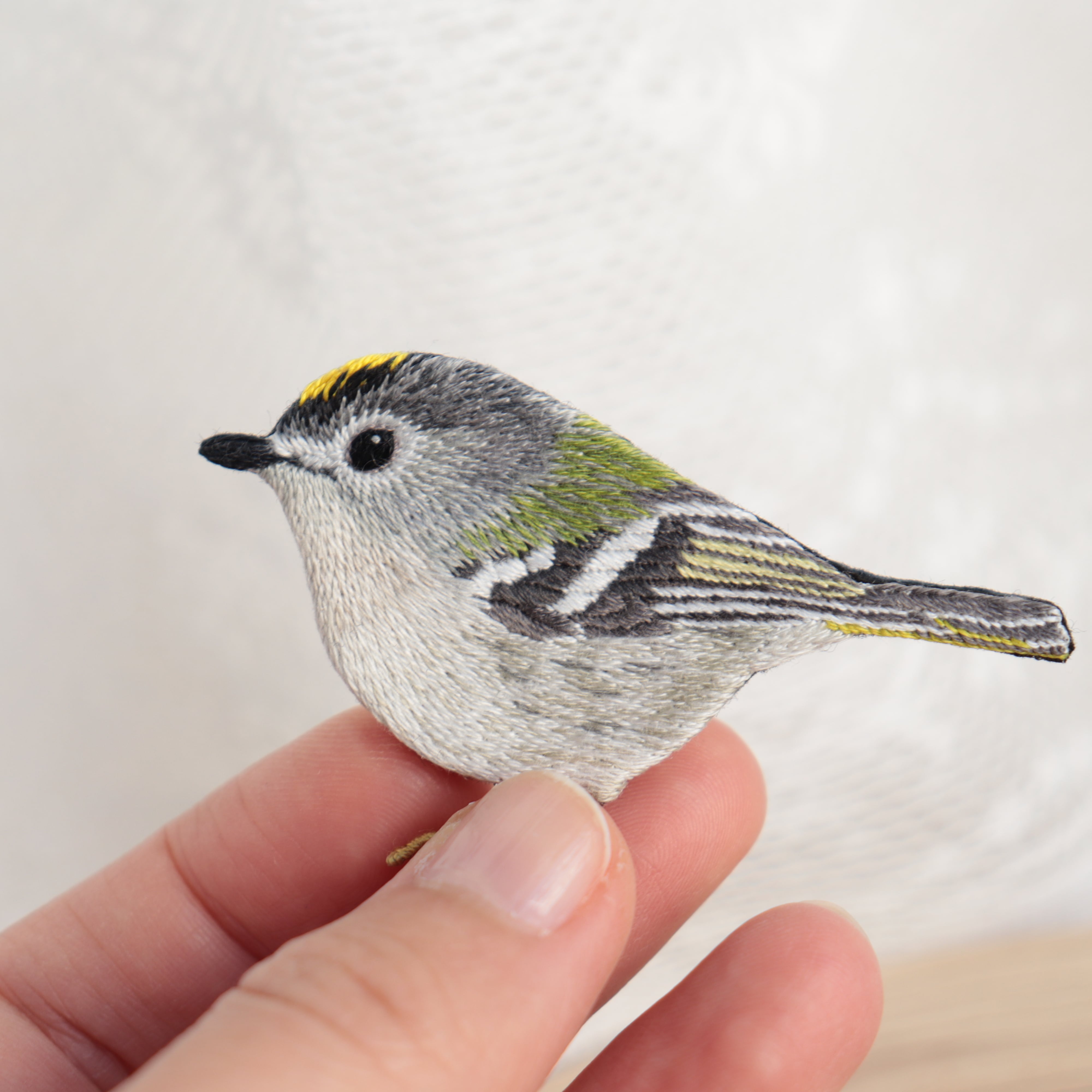 顔やお腹の羽には複数の糸を組み合わせて刺繍しキクイタダキの色彩を表現しています