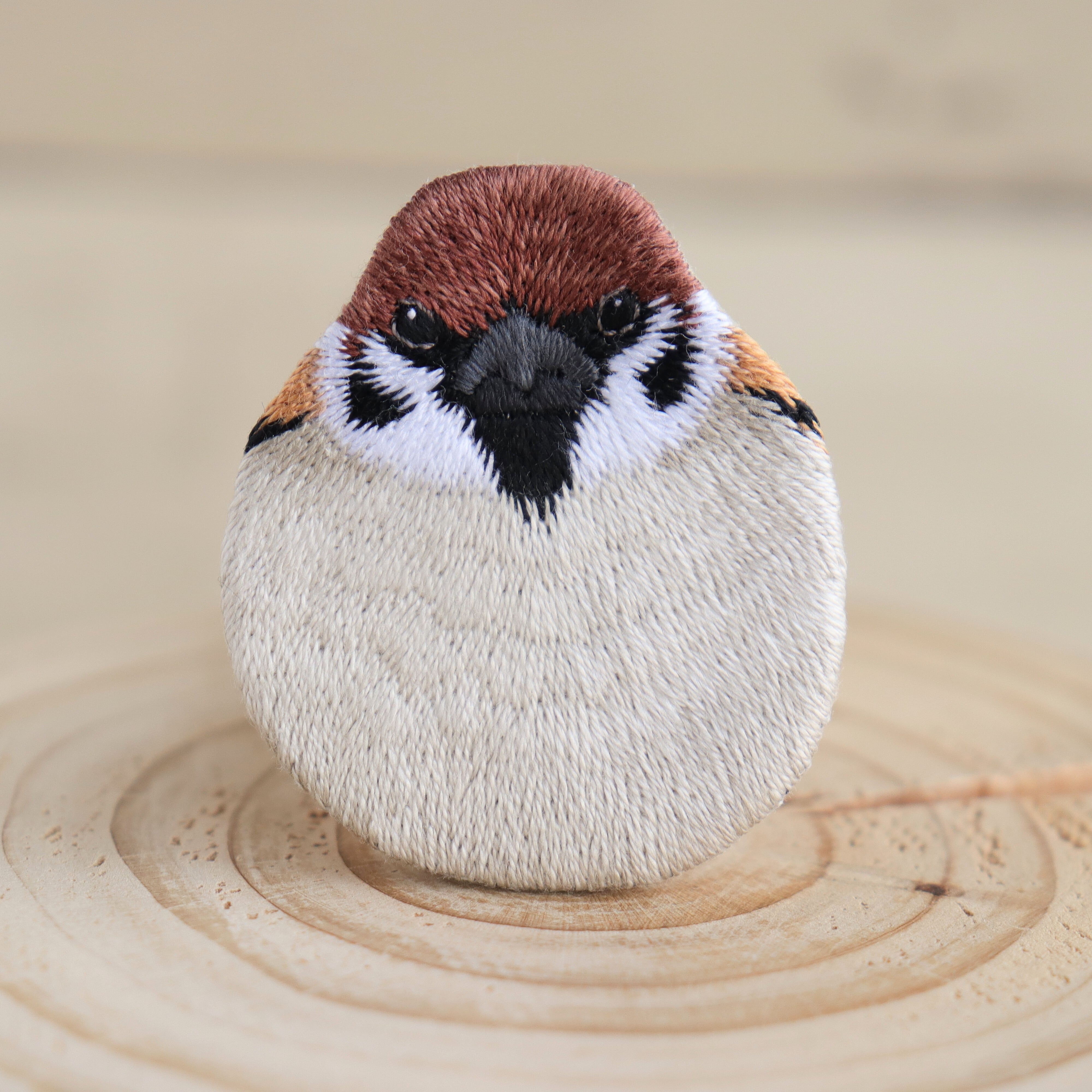 正面からこちらを見つめるまるいまるいスズメをふんわりまんまるに刺繍しました。