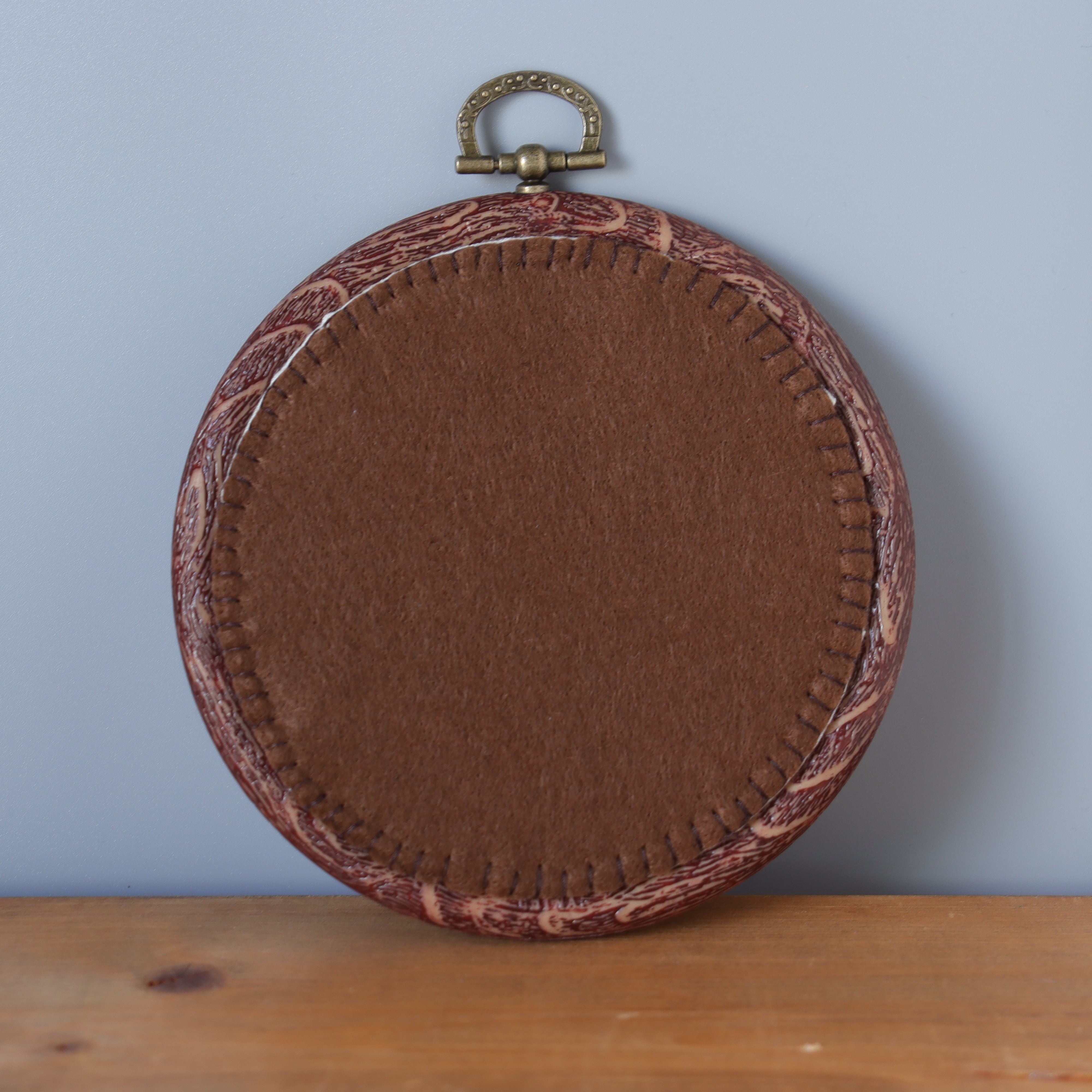 木目調のフレームにレトロなスタンプで英名を表記しています